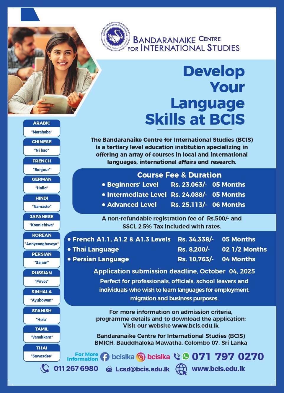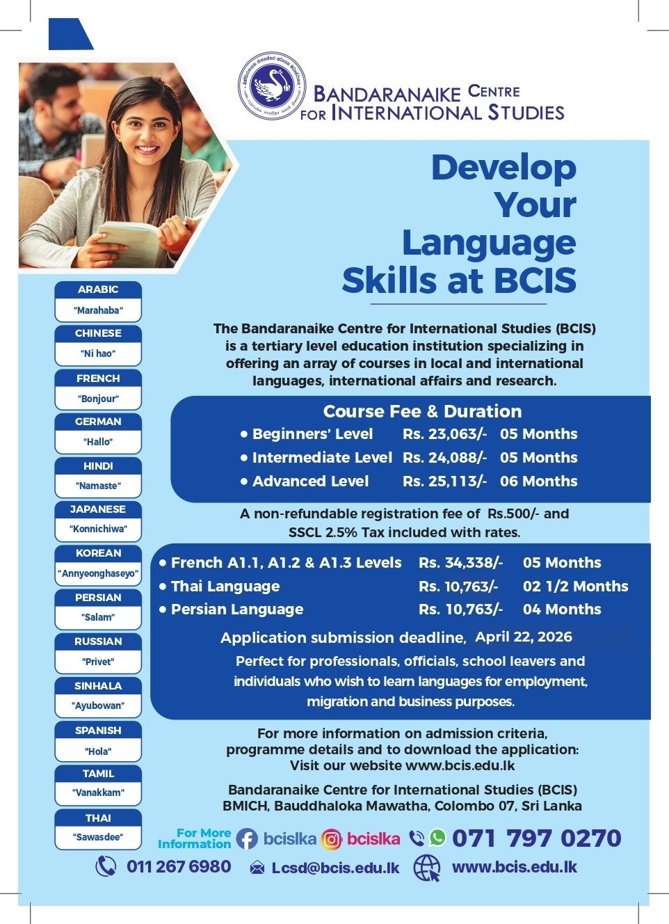 At present, our offering includes Chinese, French, German, Hindi, Japanese, Korean, Spanish, and of course, Sinhala, Tamil.